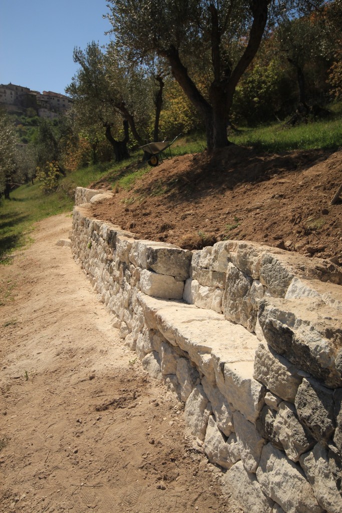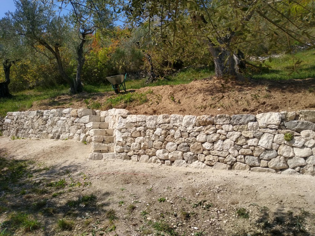 Création d’un petit mur de soutènement d’une terrasse d’oliviers avec deux installations sur demande : un banc et un escalier en pierre sèche (calcaire) pour accéder à la terrasse. Réalisé pour un particulier dans la commune de Capestrano en Italie.